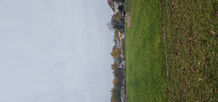 This image captures an outdoor scene in Kamenz - Kamjenc, Germany, under an overcast sky. The foreground features a dark green grassy area with scattered brown fallen leaves, indicating an autumn season. This transitions into a lighter green, well-maintained lawn in the mid-ground, where small white floral elements are visible. No individuals are present in the foreground or mid-ground. The background consists of a tree line displaying autumnal foliage in shades of green, yellow, and brown. Behind these trees, several residential buildings are visible. These include structures with light-colored facades, some featuring visible rooftop solar panels. Towards the center-right, a yellow-painted house is prominent, with a white recreational vehicle (RV) or camper parked in front of it. Further to the right, a multi-story residential building with a reddish roof is discernible. A black passenger vehicle is parked on what appears to be a street or driveway in front of the background structures. Adjacent to the grassy area on the mid-right, a light-colored, multi-segment structure, possibly a decorative bench or low barrier constructed from horizontal planks, is present. The upper half of the image is dominated by a uniform light gray, cloudy sky. No human activity or interactions are depicted.