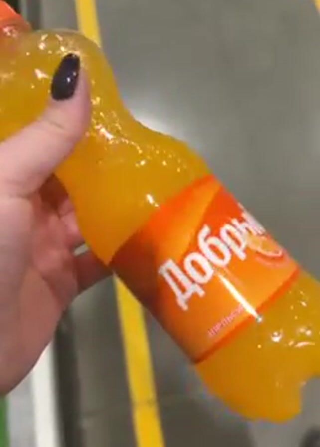 A hand with dark nail polish holds a plastic bottle of orange soda. The bottle's label says "Добрый" in Russian, which means "Good" in English. The bottle has an orange lid. The background is a grey floor with a yellow stripe. The hand is shaking the bottle.