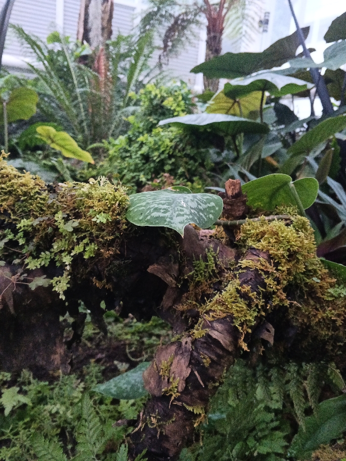 A close-up showcases a mossy branch, draped with various plants and greenery. Predominantly, different mosses and small ferns thrive on the wood's surface. A speckled leaf is perched on the branch. Background features lush, diverse foliage including ferns, large-leafed plants, and taller trees, possibly within an indoor botanical garden setting. The light suggests a controlled environment, with soft, diffused illumination.