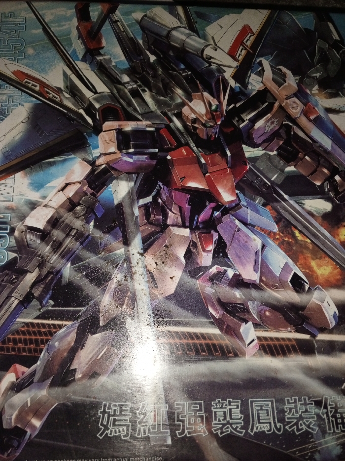 A stylized, colorful robot stands in a dynamic pose against a chaotic background of smoke and structures. The robot is primarily red, black, and white, with highlights of blue and purple. It is armed with large guns and weaponry, suggesting a combat-ready state. The image is likely an illustration or a promotional image for a toy or game. Chinese characters are visible at the bottom of the image.