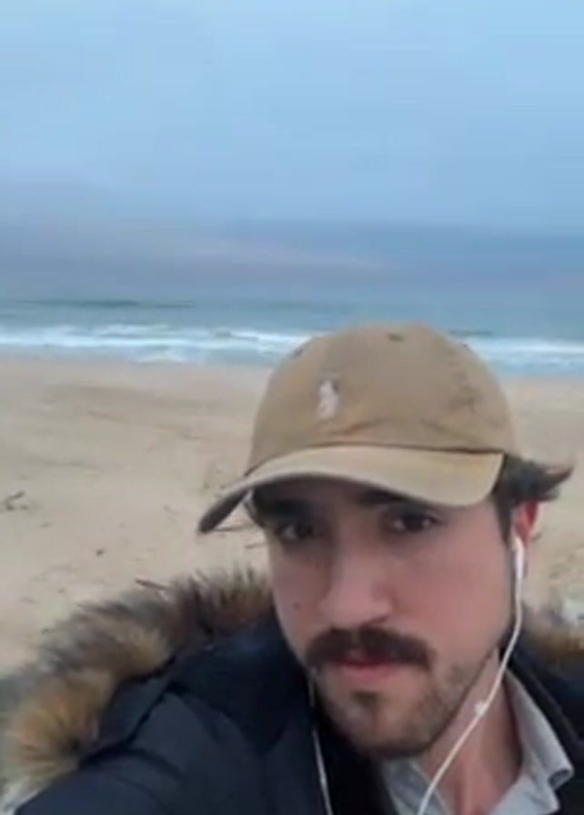 A medium shot features a man with a mustache, wearing a baseball cap, a jacket with a fur-lined hood, and wired earbuds, looking directly at the camera. He smiles. The background shows a beach, with ocean waves and a light blue sky.