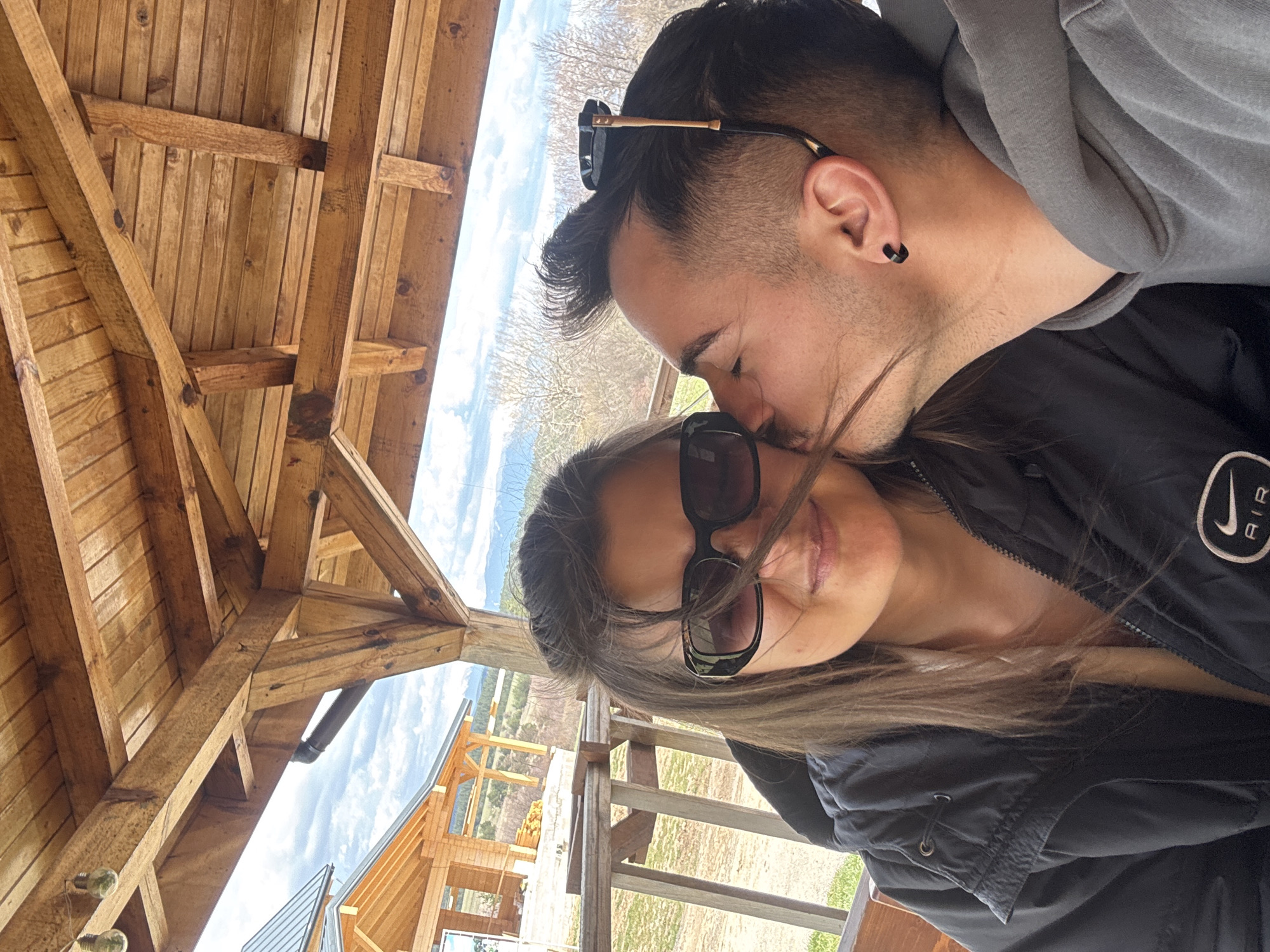 A man kisses a woman on the forehead. The photo was taken outdoors in Kovachevtsi, Bulgaria. The woman wears sunglasses and a black jacket, with a logo that appears to be Nike. The man has an earring in his left ear and wears sunglasses on his head. They stand within or near a wooden structure, with a view of trees and sky visible in the background.