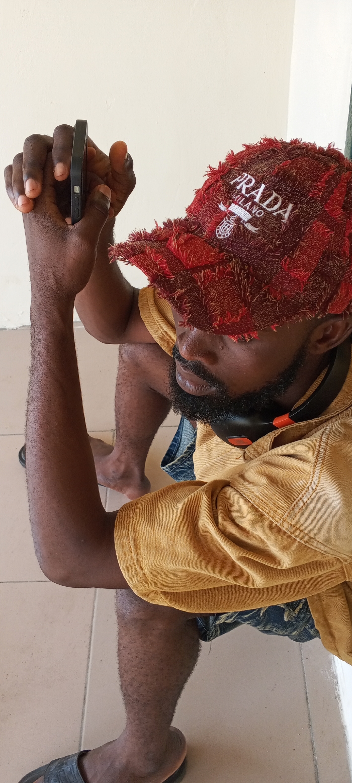 An individual is depicted crouching or squatting, observed from an elevated perspective in Ijotan, Nigeria. The subject is a male with dark skin, a black beard, and mustache. He wears a red, textured baseball cap with "PRADA MILANO" embroidered in white on the front, a mustard yellow short-sleeved collared shirt, and dark denim shorts. Black wireless headphones with orange accents are visible around his neck. He holds a black mobile phone horizontally with both hands, positioned in front of his chest and facing downwards, indicating engagement with the device. His arms are bare, and his legs are partially visible, one foot wearing a black slide sandal and the other appearing barefoot. The background consists of a plain light beige wall, and the floor is light brown tiled with visible grout lines.