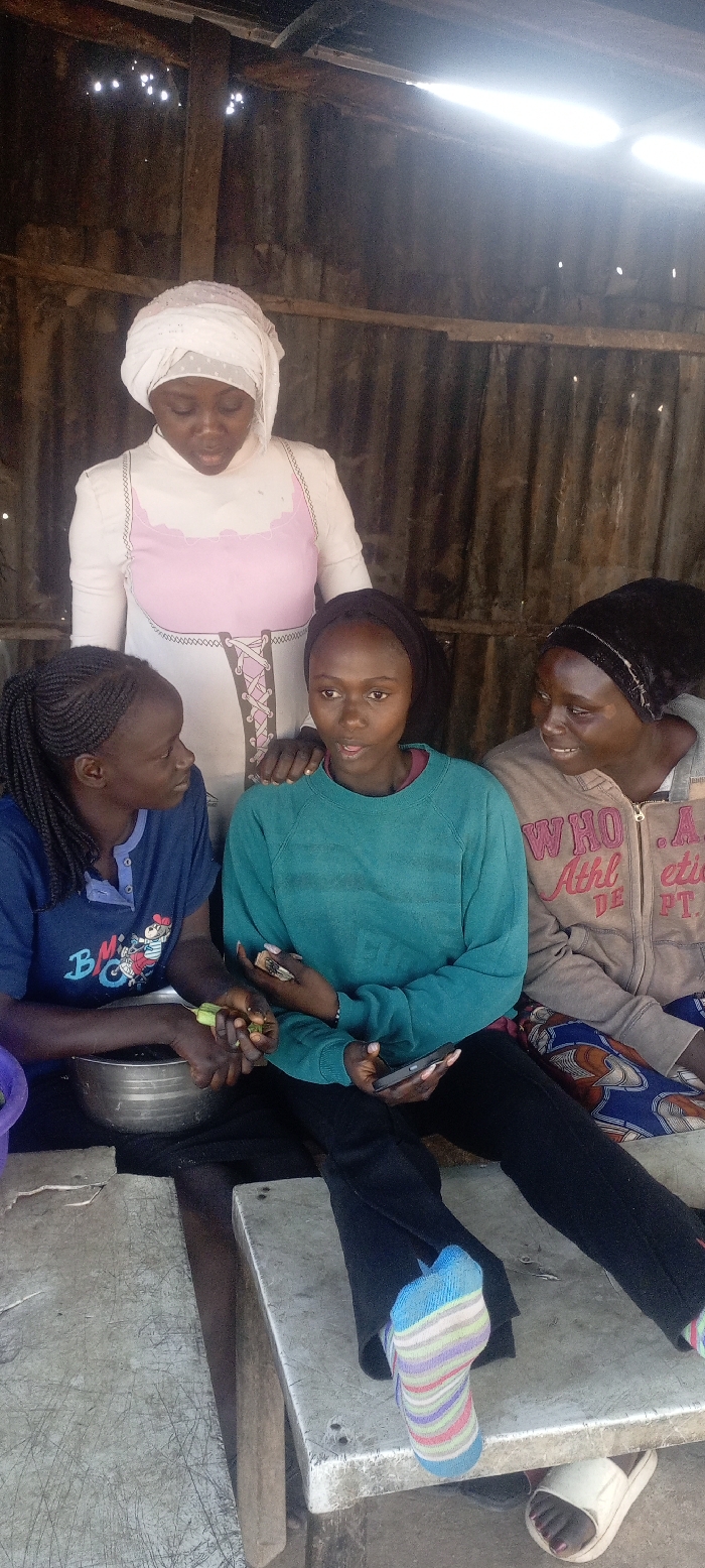 Four females are observed inside a structure with corrugated metal walls and visible wooden structural elements, located in the city of Kachia, Nigeria