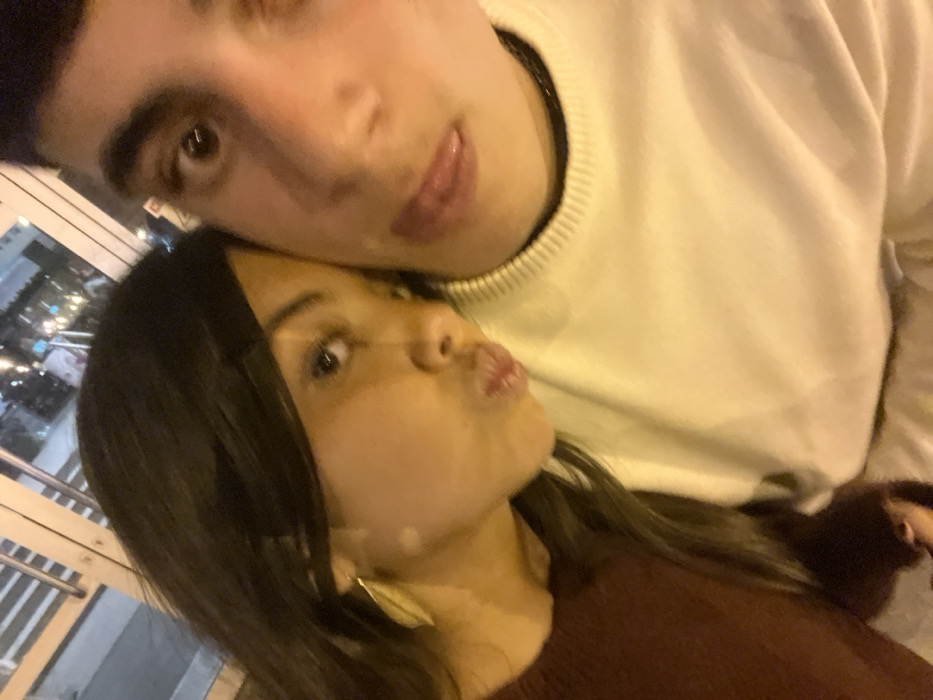 A selfie features a couple, likely taken outdoors at night. The man, with dark hair and fair skin, wears a light-colored sweater. The woman, below him, has long dark hair, pouting lips, and a dark sweater. She's wearing statement earrings. A window with city lights is visible behind them, suggesting they're at an elevated location. The photo has a slightly blurred quality due to motion or low light.