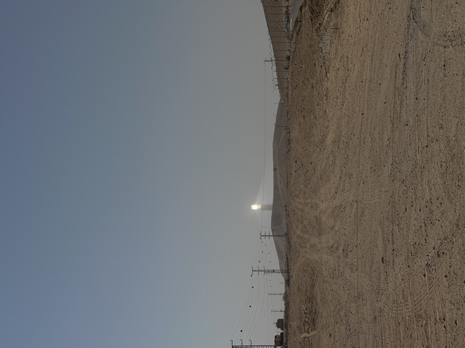 A landscape shows a stark contrast between the clear, light blue sky and the arid, brown ground. A solar tower with a bright glare stands out against the horizon. Power lines stretch along the side, indicating human infrastructure within this dry environment. The ground is marked with tire tracks, possibly from vehicles driving across the terrain.