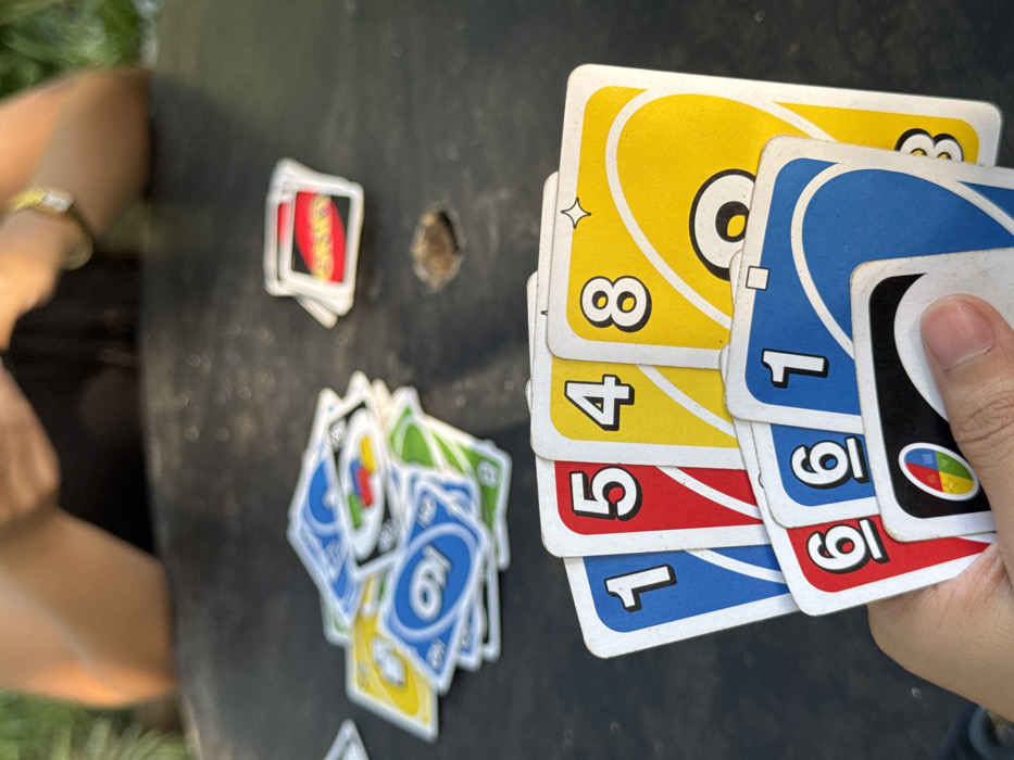 - "An overhead, close-up shot depicts an outdoor scene in an unspecified location within the city of Koronadal, Philippines, focused on a game of UNO" by FM-octGQ2, licensed under CC BY 4.0