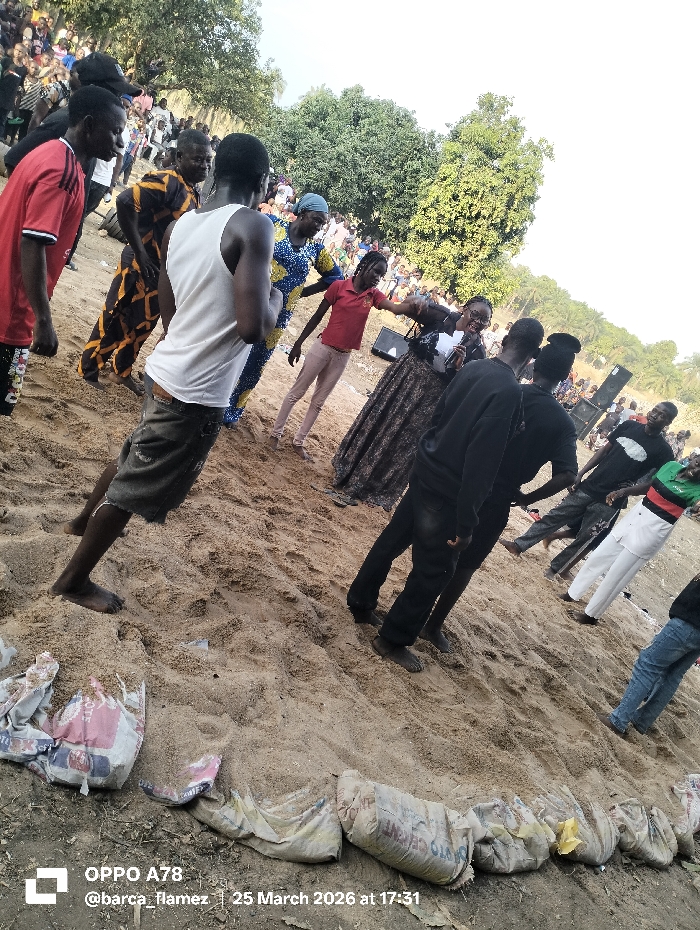 The image depicts an outdoor public gathering in Akwanga, Nigeria, captured on 25 March 2026 at 17:31. The scene is set on an uneven, sandy or dirt surface that slopes upwards from left to right. Along the lower edge of the frame, several partially buried sand or cement bags are arranged in a line, forming a low barrier or boundary. In the foreground, a bare-chested male in a white tank top and dark shorts stands with his back to the camera. To his left, another male in a red t-shirt and dark pants wears a dark cap. Further back, a male in a yellow and black patterned outfit stands near a woman in a blue and yellow patterned dress with a headscarf. In the midground, a woman in a white top and a long, dark patterned skirt holds a microphone, facing towards the right of the frame, seemingly addressing or performing for attendees. A young female in a red t-shirt and light-colored pants stands nearby. To the right of the woman with the microphone, several individuals, mostly males in dark clothing, are present; some appear to be barefoot. Two large, dark-colored speakers are visible on the ground near the microphone user. In the background, a dense crowd of people occupies a higher elevation, observing the activity. Green trees and foliage are visible beyond the crowd, under a bright, possibly hazy sky.