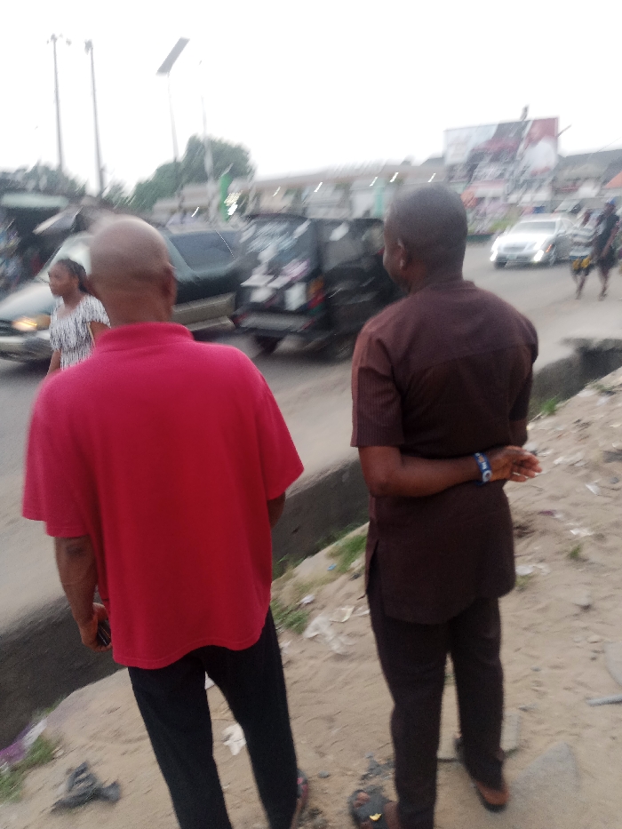 Two men stand at a roadside, backs to the camera. One wears a red polo shirt and dark pants, holding a dark object in his hand. The other wears a brown, short-sleeved shirt and matching pants, hands behind his back with a blue wristband. In the background, blurred vehicles drive along a street with a gas station visible. A few pedestrians are also present. The foreground shows a dirt patch beside a road.