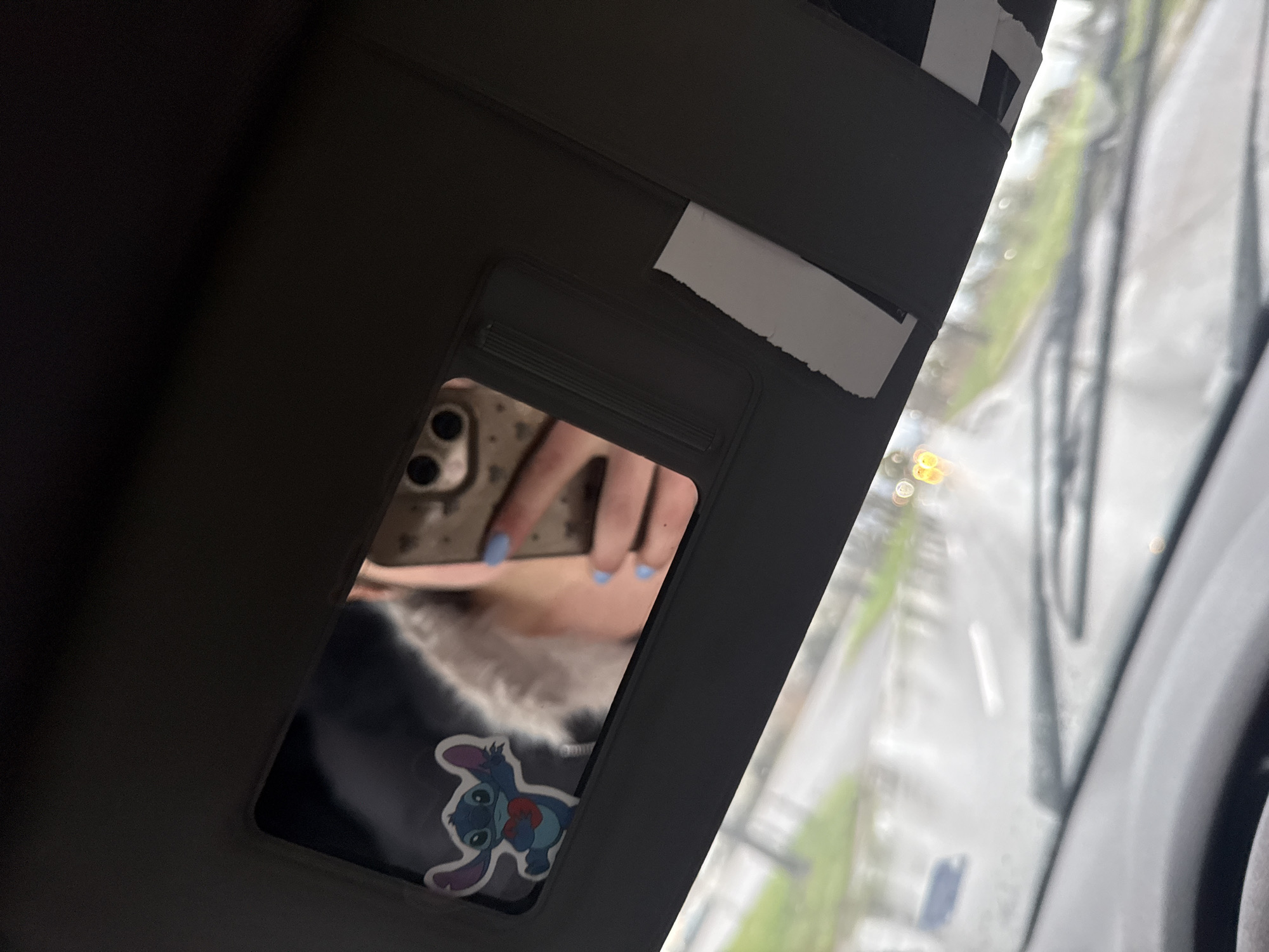 interior of a car, focusing on the passenger-side sun visor. The visor is light gray and has a vanity mirror with a flip-down cover. Inside the vanity mirror, a person is taking a picture of themself. The reflection shows a hand with light blue nail polish, a phone with a case, and a small sticker of the character Stitch on the phone case. Outside the car window, it appears to be a cloudy day. The scene seems to be a street with trees and road. The city of Yambol, Bulgaria cannot be determined from the image.