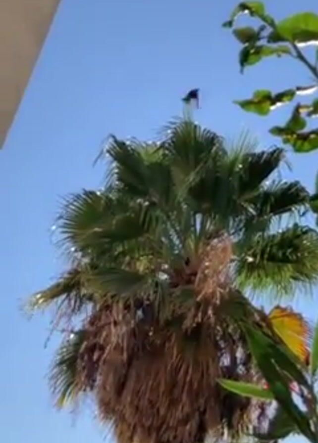sky. There is a palm tree and other plants in the foreground. Two objects are seen falling in the sky. The camera angle changes to a tree with yellow fruit, and then back to the blue sky.