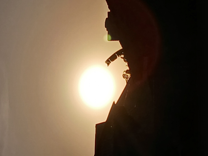 - "An outdoor, heavily backlit photograph depicts a bright, circular sun positioned centrally in the upper half of the frame, against a clear, gradient sky ranging from luminous yellow-orange near the horizon to muted beige-orange overhead" by FM-e3Nug2, licensed under CC BY 4.0