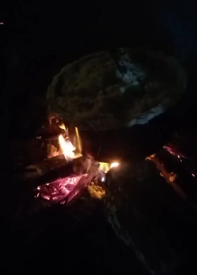A black pot is set over a burning campfire. It is nighttime and very dark. The pot is filled with a light-colored, possibly grainy substance. There is an indistinct light source behind the camera, illuminating the contents of the pot. The fire is made of orange, yellow, and red-glowing pieces of wood and ember. Some parts of the wood appear charred. The ground surrounding the fire is black.