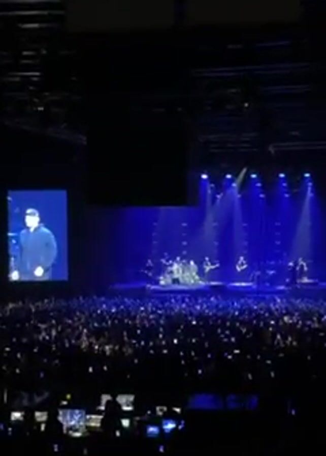 A crowded concert venue is captured in this video, bathed in a blue light. A band performs onstage, visible in the center of the frame. Flanking the stage are two large screens that display a man, identifiable as the performer. The audience, densely packed, is filled with individuals holding up their phones, likely recording the performance. The venue itself is large, with exposed ceiling rafters and visible lighting equipment.