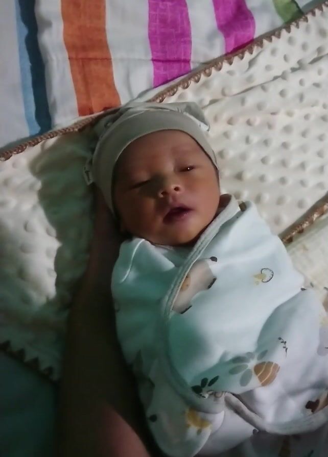 - "A newborn baby with dark skin is wrapped in a white and light gray blanket with a pattern of small dots" by FM-qDWqL2, licensed under CC BY 4.0