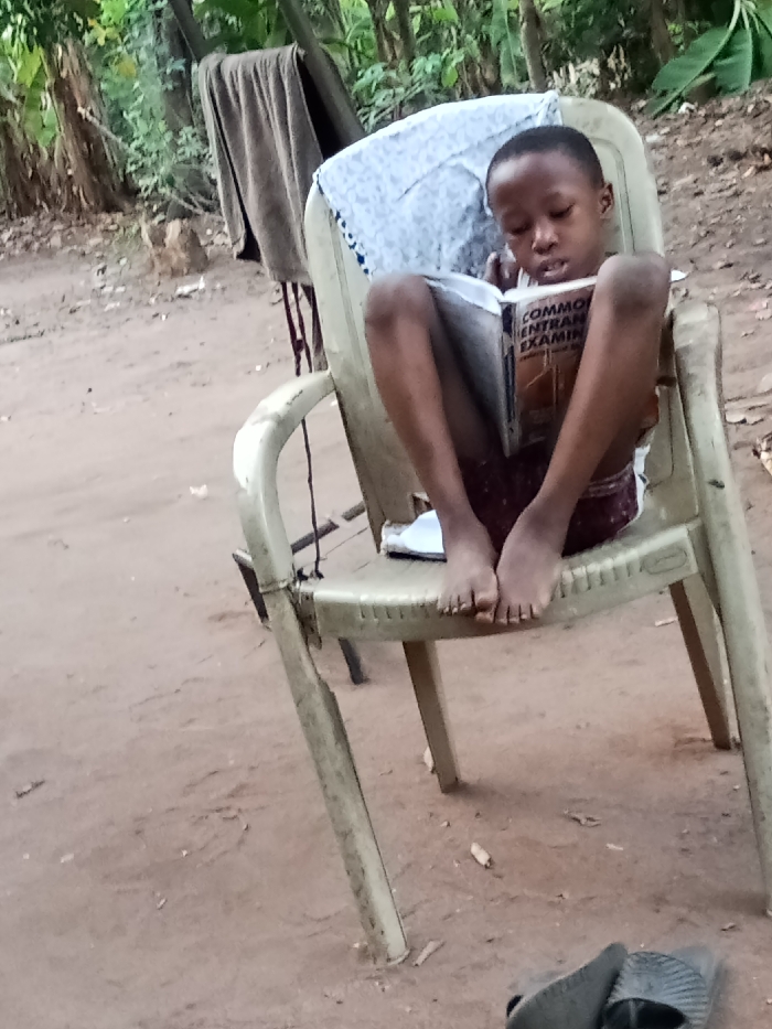 The scene depicts a young child, likely male, sitting on a light-colored plastic chair outdoors in Orji, Nigeria. The child wears a white top and dark patterned shorts, and is barefoot, with his feet resting on the front edge of the chair's seat. He is focused on reading a brown-covered book, partially open, with the visible title text "COMMON ENTRANCE EXAMINAT." A light-colored, patterned cloth is draped over the top of the chair's backrest. The ground is unpaved, consisting of reddish-brown dirt. In the background to the left, a dark brown towel hangs over an unseen structure, with dense green foliage and tree trunks visible further behind. A pair of dark-colored sandals lies on the dirt ground in the lower right foreground.