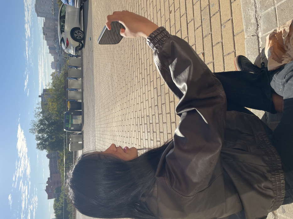 - "A young woman with long dark hair, wearing a dark brown bomber jacket and dark trousers, is seated or crouched on a light brown brick-paved surface in direct sunlight" by FM-BmcI33, licensed under CC BY 4.0