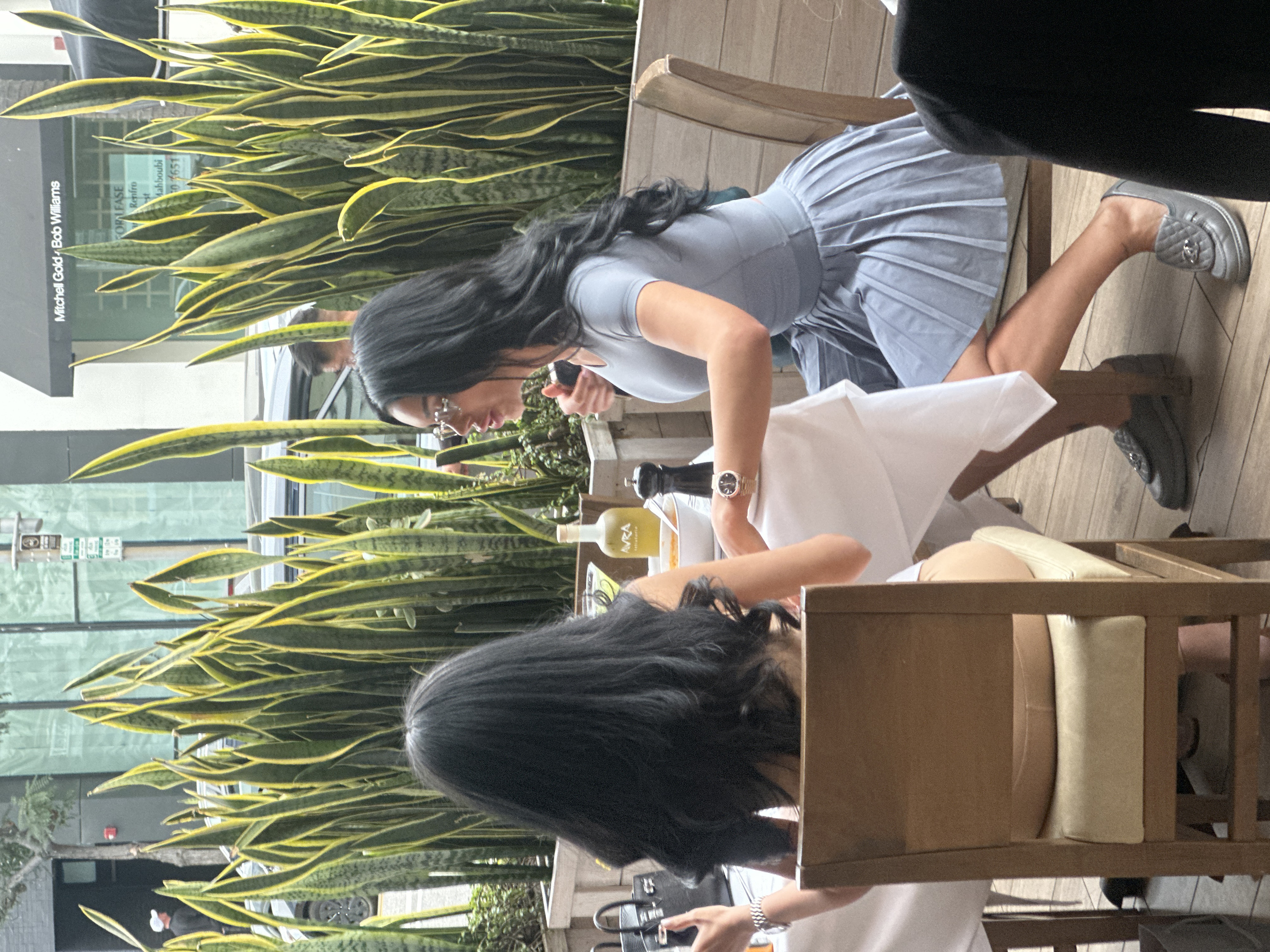 Two women sit at an outdoor dining table surrounded by tall snake plants