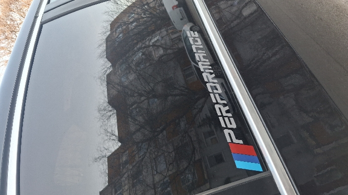 The scene depicts the tinted rear passenger window and adjacent body panel of a dark-colored vehicle, likely black, located in Kalipetrovo, Bulgaria. A sticker is applied to the lower left portion of the window, featuring the BMW M colors (light blue, dark blue, red vertical stripes) preceding the word "PERFORMANCE" rendered in white, stylized block letters. A chrome trim strip separates the window from the lower vehicle body. The window's surface exhibits significant reflections of the surrounding environment, which include several multi-story residential buildings and numerous bare tree branches. In the reflection, a light-colored station wagon or hatchback is visible, parked parallel to a white cargo van or similar commercial vehicle. No individuals or active interactions are depicted. The lighting indicates daytime conditions.
