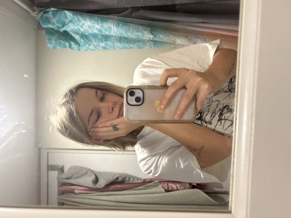A woman is visible in a mirror selfie