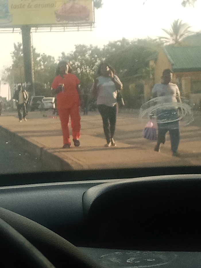 The image depicts an outdoor street scene in the city of Unknown, Unknown, observed from inside a vehicle with a dark dashboard visible in the foreground. Three individuals walk on a concrete sidewalk from left to right under daylight conditions with a hazy sky. The leftmost person wears a red scrub suit and holds a metallic object in their right hand. The middle person wears a light-colored top, dark pants, and carries a dark shoulder bag on their left side. The rightmost person wears a light-colored top, dark pants, and carries multiple clear plastic bags along with a purple bag in their left hand, while also carrying a large, clear, circular plastic object. In the background, another individual walks further to the left. A large billboard displaying partial text "taste & aroma!" and an image is visible in the upper left. Trees, foliage, a building with a dark green roof, and a palm tree are present in the mid-background. Distant vehicles are also visible on the road.