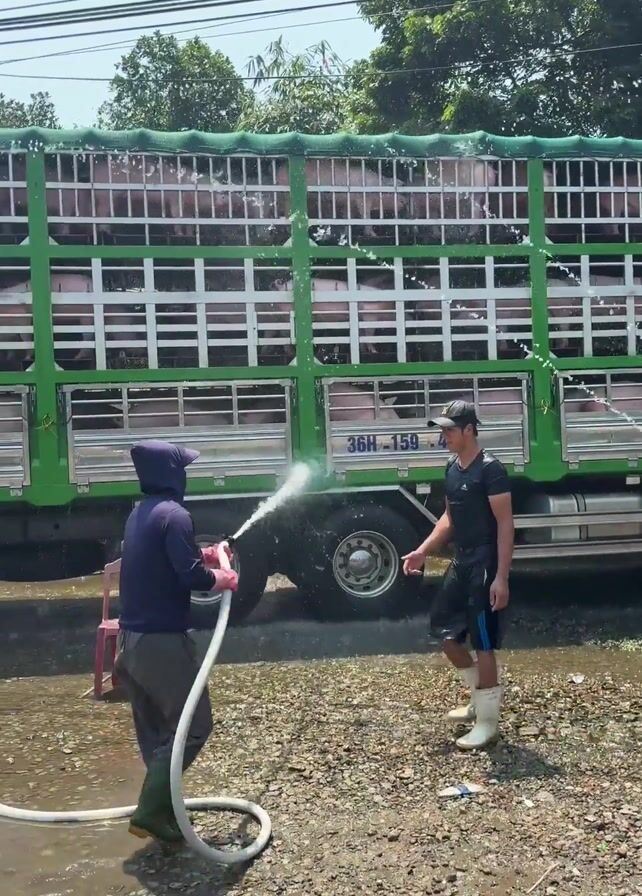 - "two people using a hose to spray down a green and silver livestock truck full of pigs" by FM-5San93, licensed under CC BY 4.0