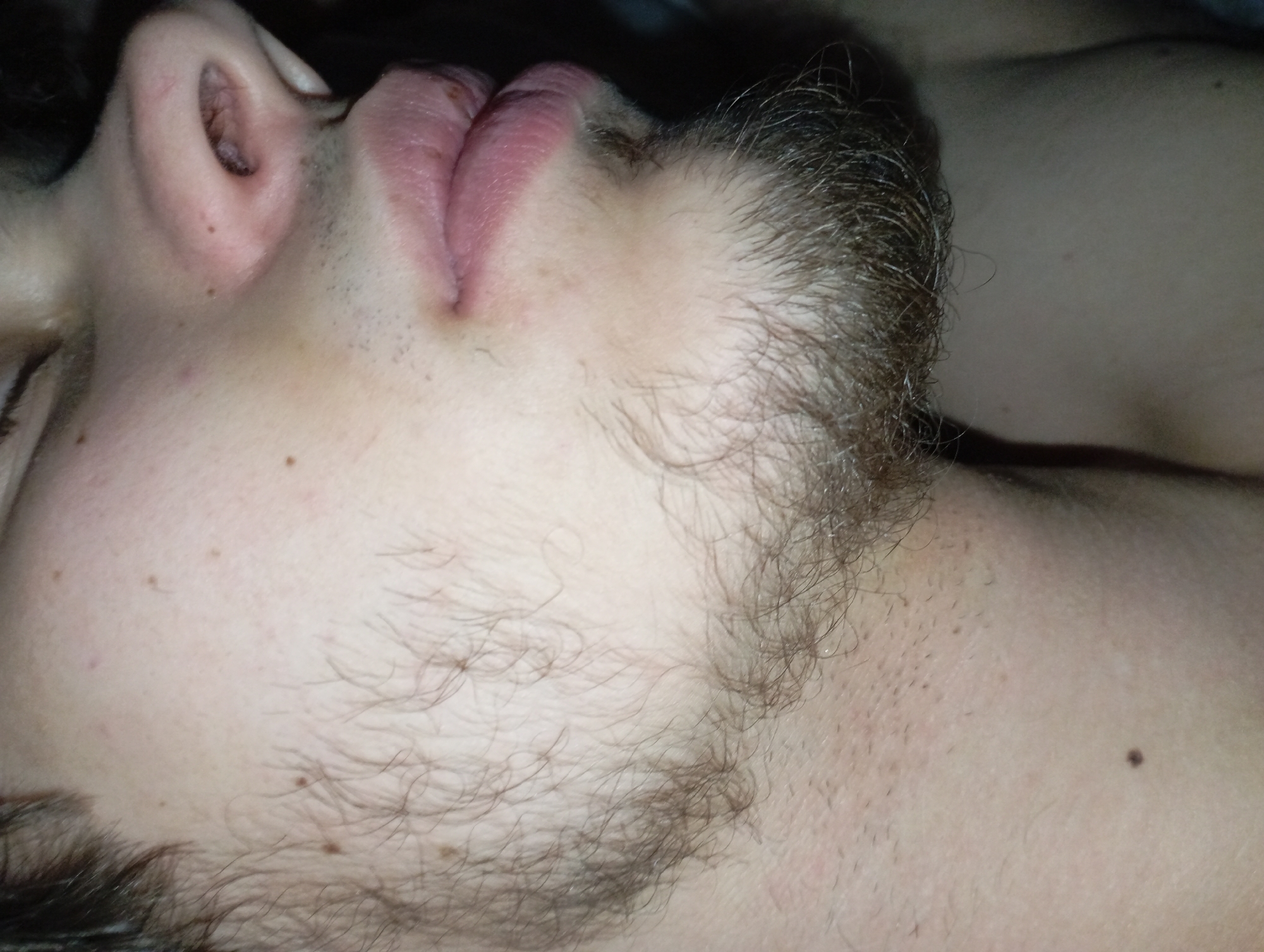 A close-up, low-angle shot depicts a person's face, turned to the side. The focus is on the nose, lips, cheek, and neck, revealing details like facial hair, skin texture, and the contours of the nose and lips. The lighting appears dim. The person is lying down. There is no indication that the image was taken in Krasnodar, Russia. The information is not contained within this image.