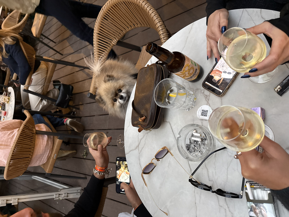 The image depicts a high-angle, close-up view of a white marble-patterned table within an outdoor dining area in Lille, France. On the table are several items: two wine glasses containing clear, pale yellow liquid, a clear glass filled with water and a lemon wedge, and a brown glass bottle with a yellow and orange label marked "Kombucha." Also present is a round glass ashtray holding two extinguished cigarette butts and ash, a black lighter, an open pack of cigarettes, two pairs of sunglasses (one black, one gold-framed), a small brown leather pouch consistent with a Louis Vuitton monogram design, a small purple box, and a circular white sticker with a black QR code. Two smartphones are visible: one held by a hand on the left displays an image of food, and another on the right displays an image of a person. Two individuals are partially visible at the table. On the left, a person's left arm and hand wear an orange bracelet while holding a wine glass and the phone displaying food. On the lower right, a person's hands, adorned with dark blue fingernail polish, hold the second wine glass and rest near the phone displaying a person. In the mid-ground, a fluffy, light brown and cream-colored Pomeranian dog with dark eyes and nose is positioned on or behind a wicker chair, looking directly towards the table. The chairs are constructed from a woven rattan-style material. The flooring consists of parallel wooden planks. Blurred figures of other patrons seated at similar tables are visible in the background.