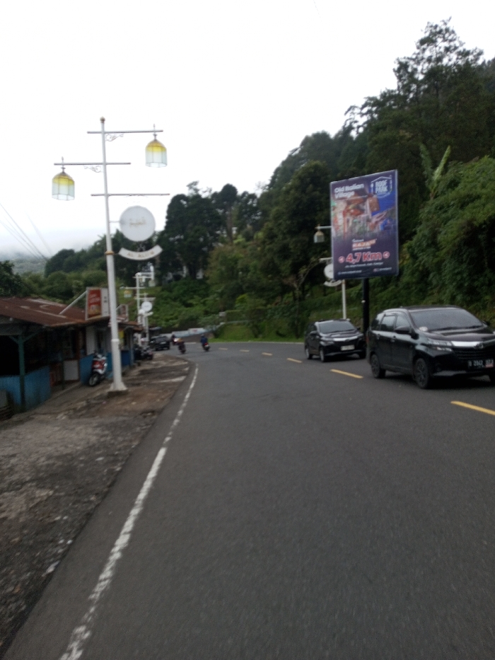 The scene depicts a street in Phoxay, Laos, under an overcast sky. An asphalt road occupies the center and foreground, featuring a broken white line on its left edge and yellow lines further down. On the left side of the road, a dirt shoulder transitions into a concrete pathway bordering a series of single-story structures with weathered facades and corrugated metal roofs. One building is distinctively blue. Several motorbikes are parked near these buildings, including one red and one white. Ornate white street lamp posts, each with two yellow and white lanterns, are positioned along the left, one displaying a circular white sign with illegible script. On the right side of the road, a densely vegetated hillside rises steeply. A large vertical billboard is prominently situated on the right, displaying imagery for "Old Italian Village" and "1 ROOF PARK," with text indicating "4.7 Km." Two black sport utility vehicles (SUVs) are traveling in the right lane, moving away from the viewer; the rear vehicle exhibits a license plate reading "B 2842 BIZ." Multiple motorbikes are also visible further down the road on the left, with some appearing to be in motion. The background shows hazy, tree-covered hills.