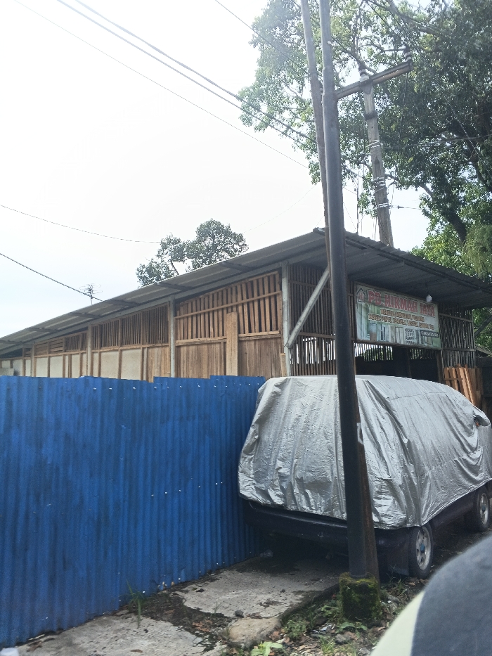 A covered car sits beside a blue corrugated metal fence. Behind them stands a long, open-sided structure with a grey roof, partially constructed from wood. A sign hangs on the building, obscured by the pole of a utility pole. Overhead, power lines extend towards trees. The sky is overcast.