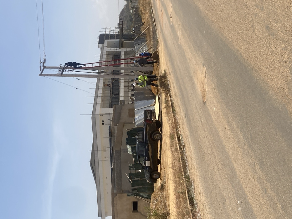 The image depicts a utility work scene and active construction under clear skies in Gwong, Nigeria