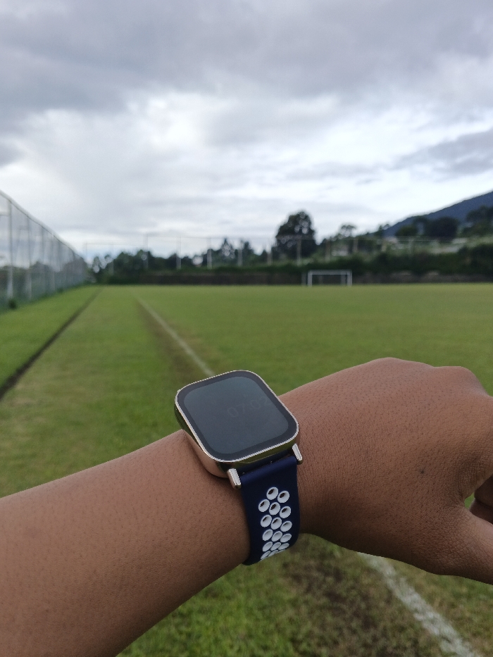 A person's wrist wearing a smartwatch on a blue and white patterned band is prominently displayed. The watch face is dark, hinting at a digital display. The background reveals a soccer field under a cloudy sky, lined with fencing on one side. In the distance, trees and a small mountain are visible. The focal point is the watch, drawing attention to the time or other information it might be displaying.