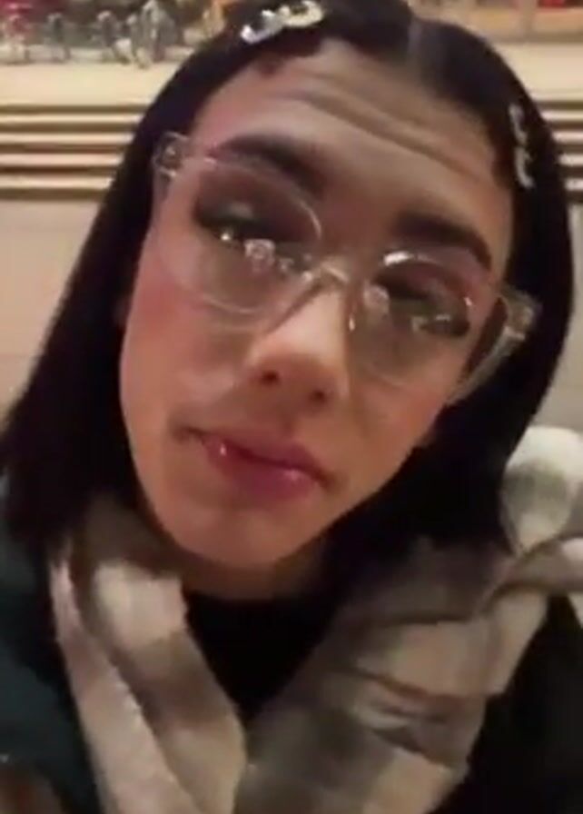 A medium shot shows a young woman with long, dark hair and clear-rimmed glasses, standing outside in what appears to be an urban environment. She is wearing a neutral-colored scarf and a dark jacket or top. Her hair is adorned with decorative clips, possibly butterfly-shaped. The background shows blurred lights and architectural elements, suggesting a building facade. There is signage visible, including the word "CINEPLEX," indicating a movie theater. The woman looks directly at the camera with a neutral expression. The camera appears to be hand-held, as there is some slight movement.