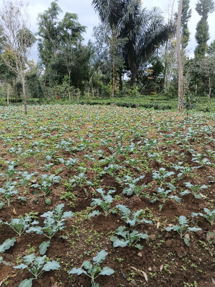 This image depicts an agricultural field within the city of Unknown, Vietnam. The foreground shows an expanse of dark brown soil cultivated with numerous young green plants, likely brassicas, arranged in discernible rows. Interspersed small weeds are visible among the cultivated plants. In the midground, beyond the rows of young plants, a dense band of mature, dark green shrubs, consistent with tea plants, forms a horizontal line across the scene. The background consists of a thick, natural treeline featuring various species, including tall, slender trees with light-colored trunks and a prominent, dark-fronded palm tree. The sky is overcast, indicating diffused natural lighting. No human subjects, animals, or active interactions are present.