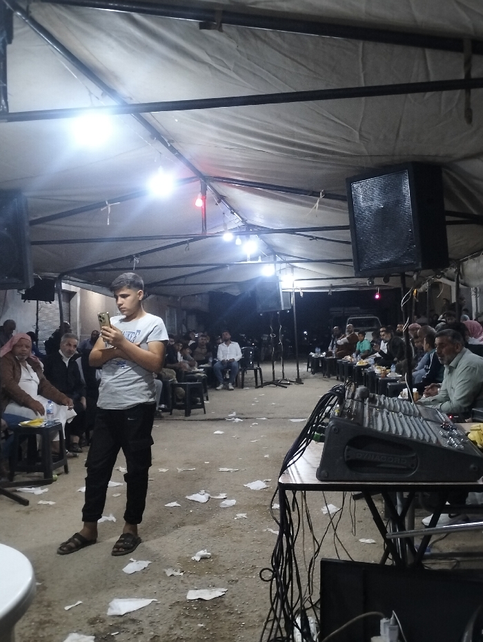 - "The scene depicts a nighttime gathering in Al-Ghanto, Syria, occurring under a light-colored tent canopy supported by dark metal poles" by FM-4RDN43, licensed under CC BY 4.0