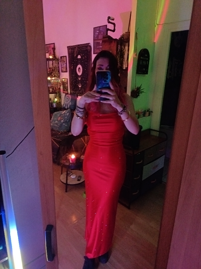 A person in a red, strapless dress stands in front of a mirror, taking a selfie with a smartphone. The dress is form-fitting and extends to the floor. The background contains various decorative items, including wall hangings, candles, and plants. A door with a view into another room is visible on the right side of the mirror. The room is illuminated with colorful light, with pink on the left and green on the right.