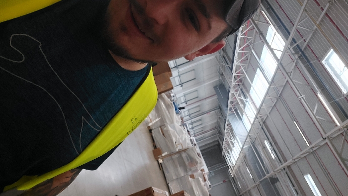 The image displays a male individual capturing a selfie within a large industrial warehouse located in Senec, Slovakia
