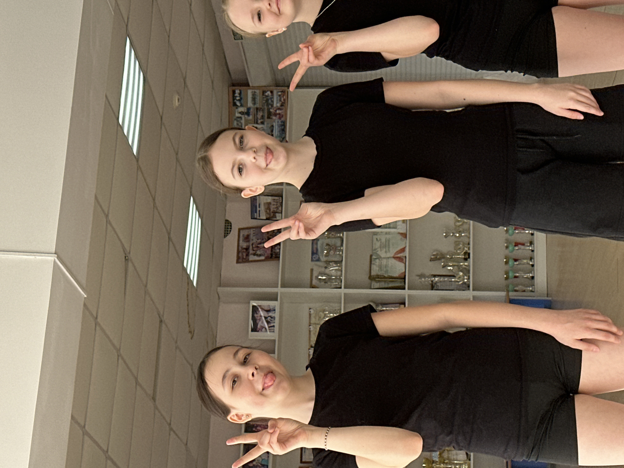 Three young females are depicted standing side-by-side indoors, located in Votkinsk, Russia
