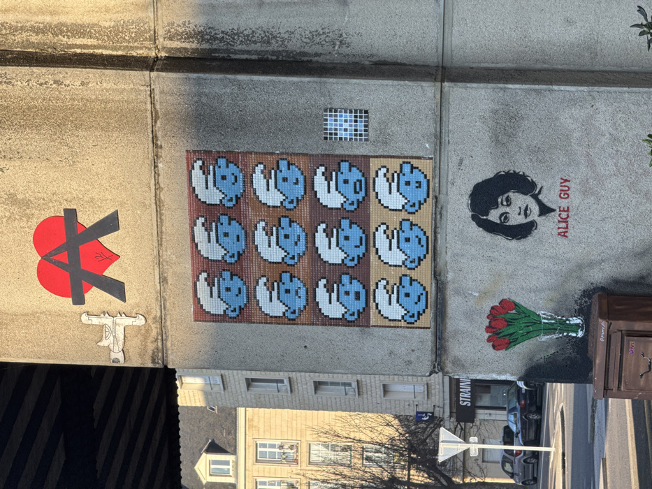 The image displays a concrete support pillar located under the Pont de Vaucelles (Vaucelles Bridge) in Caen, France. The pillar is adorned with multiple pieces of street art. At the top, a red heart with a black anarchist 'A' symbol is affixed, with a small white relief sculpture of a stylized airplane to its left. Below this, a large rectangular pixel art mosaic features twelve blue Smurf heads with white hats, arranged in four rows of three on a brown and beige tiled background. To the right of the Smurf mosaic, a smaller square pixel art piece shows a blue "8" or similar shape on a blue and white grid. Further down, two stencils are visible: a bouquet of red tulips in a clear vase on the left, and a black and white portrait of a woman with curly hair, identified by the red stenciled text "ALICE GUY" below it. At the base of the pillar, a brown wooden utility box or cabinet is present, with faint graffiti including "LOVE" and "p@me.de." The immediate environment shows the dark underside of the bridge structure overhead. In the background to the left, a light-colored, multi-story building with multiple windows is visible under sunlight, partially obscured by bare trees. A street with two parked cars (a silver hatchback and a dark sedan) and a white triangular traffic sign are also discernible. A commercial sign with the word "STRAIN" is partially visible on a building further down the street. The scene is illuminated by sunlight, casting shadows that darken the right side of the pillar.
