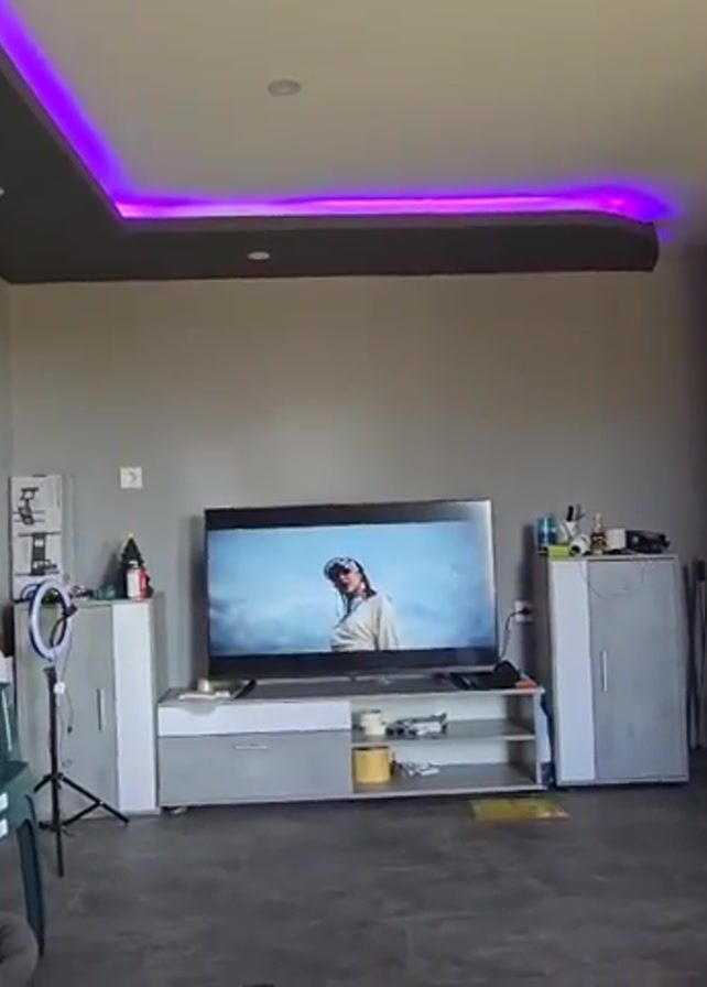 room that appears to be a living area. The walls are painted a neutral grey, and the ceiling has a darker grey section with recessed lights and a strip of purple LED lighting around the edge. A flat-screen TV is the focal point, playing a video of a person wearing a virtual reality headset. Below the TV is a grey and white TV stand with items on the shelves. To the left of the TV is a small white cabinet with items on top, including a Christmas tree decoration, and a ring light on a tripod. To the right is another taller white cabinet. A green plastic chair sits on the left side of the room, near a mirror leaning against the wall. A refrigerator is visible on the right side of the room. A dark doorway or closet is also visible in the background. The floor is a grey tile. Music is playing.
