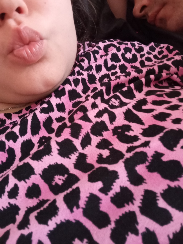 The image displays a close-up, oblique view featuring two individuals. In the foreground and occupying the lower-left portion of the frame is the lower half of a face, exhibiting light-toned skin. The lips are pursed forward in a distinct gesture. A slender, golden-colored chain is visible just above the neckline. This individual is wearing a garment with a pink background and black leopard print pattern, which covers the majority of the image area. To the upper-right, partially obscured by the first individual, is a segment of a second person's face, including a portion of the nose and upper lip. This second individual appears to have darker skin tone and is wearing a plain dark-colored garment. Both individuals are in very close proximity, suggesting an intimate interaction or pose. The lighting is soft and even, and the background is out of focus, providing no discernible environmental details. The precise location within the city of Sochi, Russia, is not discernible from the visual information provided.