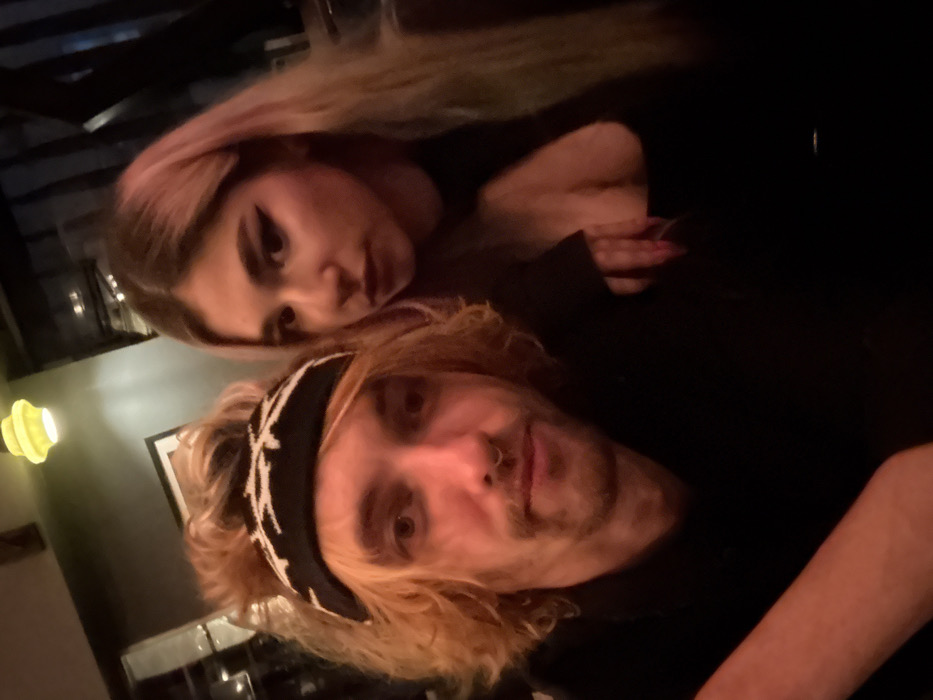 The image depicts two individuals, one male and one female, in a dimly lit indoor setting. The specific location within Tel-Aviv, Israel, cannot be determined from the visual information provided. The male subject occupies the foreground on the left. He has light brown to blonde, wavy hair styled with some volume on top, and wears a black bandana featuring a white, barbed-wire-like pattern across his forehead. He possesses a light mustache and beard, and a silver ring septum piercing. His gaze is directed forward, towards the camera, with a neutral facial expression. He is wearing a dark, unidentifiable top. His right arm, partially visible in the lower left, appears illuminated with a reddish hue. The female subject is positioned to the right and slightly behind the male. She has long, straight or gently wavy blonde hair with darker roots, extending over her shoulders. Her face is made up with dark, winged eyeliner and dark lipstick. She wears a black top with a distinctive keyhole or cut-out design on the chest, revealing cleavage. Her left hand is resting on the male subject's right shoulder or upper arm, with fingernails painted red or pink. Her gaze is directed slightly off-camera to the right, and her expression is neutral to slightly serious. The background is dark and indistinct, featuring a partial view of a framed object behind the male's head and a wall with subtle texture. A yellow-colored light fixture is visible in the upper left corner of the frame. The overall lighting is warm and subdued.