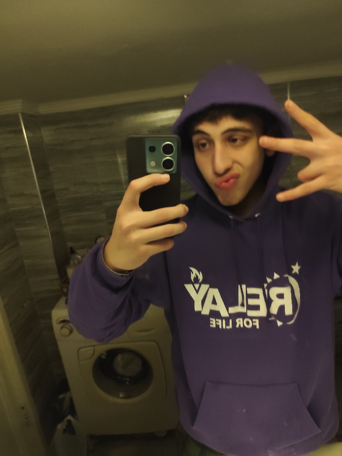 - "A young man with dark hair and eyebrows wears a purple hooded sweatshirt with white lettering that reads "RELAY FOR LIFE"" by FM-BskwX2, licensed under CC BY 4.0
