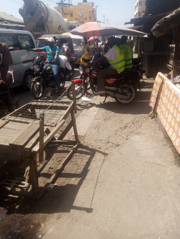 Two motorcycles and a gray van sit in a traffic-filled street, with a cement mixer truck visible in the background. Two men on one of the motorcycles wear yellow vests. An open wood table sits at the street's edge, casting a shadow. The road appears unpaved and has debris. A building with orange accents stands to the side. An umbrella-covered market is visible, with people gathered nearby.