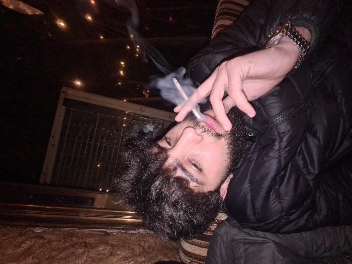 A person lies on their side, clad in a black puffer jacket, holding a lit cigarette to their lips, exhaling smoke. The individual sports dark, curly hair and a beard. A silver wristwatch adorns their wrist. Behind them, a lit radiator casts a warm glow, while decorative lights twinkle in the dimly lit background.