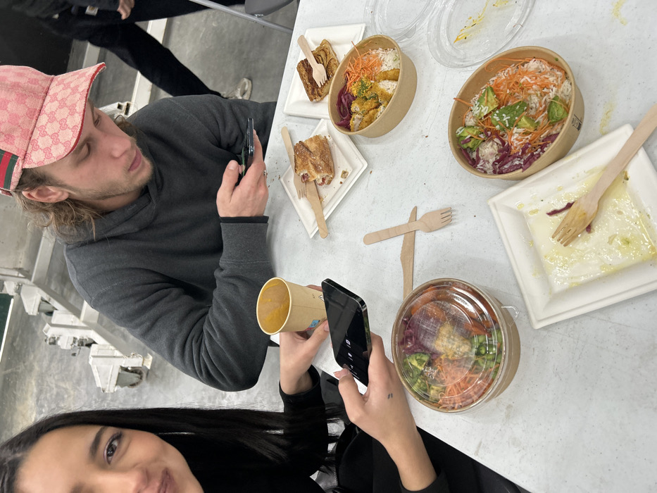 The scene is an indoor, informal dining or break area, stated to be in the city of Pommeuse, France. Two individuals are seated at a light-colored table, with a third person partially visible in the background against an industrial-style setting featuring white machinery on a light gray floor. On the left, a female with long dark hair, wearing a black top and a silver hoop earring, is partially visible from the chest up, looking towards the camera with a slight smile. She holds a black smartphone horizontally in her left hand and a light brown paper cup containing an orange-yellow liquid in her right. A small tattoo is visible on her left forearm. Next to her, a male with light brown, wavy hair, wearing a pink Gucci baseball cap and a dark gray hoodie, is focused on a black smartphone held in both hands. A ring is present on his right hand. The table surface displays multiple food items in disposable containers. These include: a sealed round paper bowl with a clear plastic lid, revealing a colorful salad; two small white square plates, one holding a partially consumed sandwich with a wooden fork, the other an eaten pastry with a wooden fork; and two open round paper bowls, one containing rice, breaded chicken pieces, shredded carrots, and red cabbage, and the other containing rice, avocado slices, shredded carrots, and red cabbage. An additional empty white square plate with food residue and a wooden fork, along with a loose wooden knife and fork, are also on the table. The third individual, in the background, is wearing dark pants and light-colored shoes, and appears to be in motion, partially obscured. The two seated individuals are primarily engaged with their respective smartphones during this meal or break.