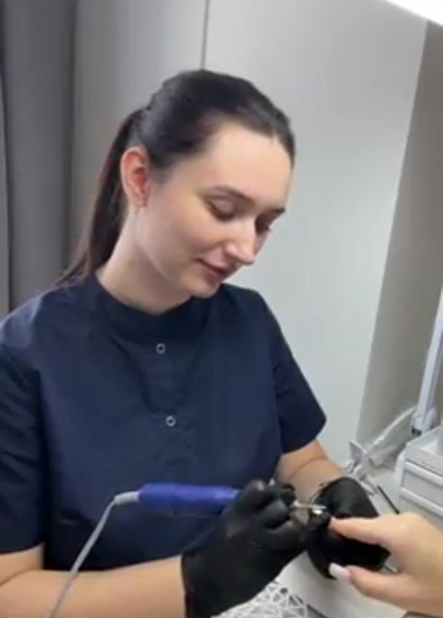 A woman with brown hair pulled back in a ponytail is doing a client's nails in what appears to be a salon