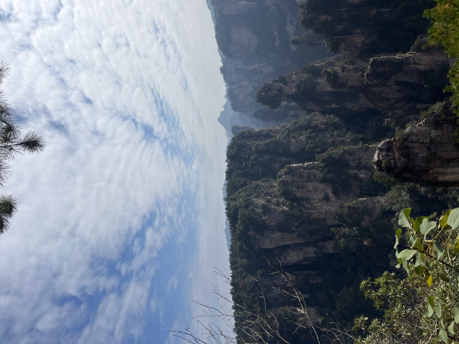 Towering rock formations covered in lush greenery dominate the right side of the frame, their sheer cliffs stretching into the distance. The sky, a blend of blue and white, fills the left half, adorned with scattered clouds. Trees and shrubs are present in the foreground, both on the left and right, adding depth to the scene. The landscape appears to be elevated, providing a sweeping panoramic view.