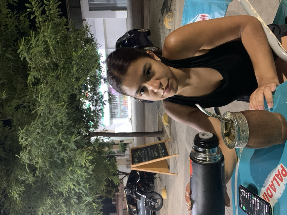 A woman sits at an outdoor table, wearing a black tank top. She has dark hair and is looking towards the camera. On the table are a mate gourd with a silver bombilla, a black thermos, and a smartphone. The table is blue and has the word "PALADIN" printed on it. In the background, there is a street scene with a tree, a chalkboard sign, and a motorcycle parked on the sidewalk. A building is visible in the distance. The setting appears to be an outdoor cafe or restaurant.