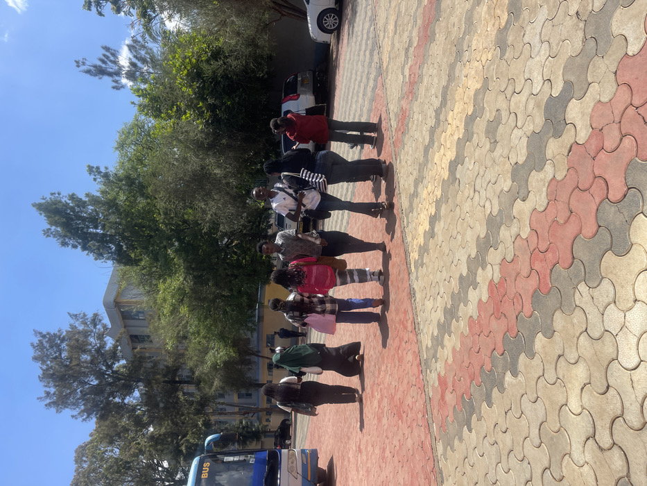 The scene depicts an outdoor area within the location specified as a Hospital ward, Kenya, under a clear blue sky during daylight hours. A group of approximately ten individuals, primarily young adults, are observed either walking or standing on a paved surface. The ground is covered with interlocking concrete blocks in a wavy pattern, colored in red, grey, and light tan/cream. On the far left of the frame, the front portion of a blue bus, with "BUS" visible, is parked. In the background, a multi-story building with light-colored walls and multiple windows is partially visible, largely obscured by numerous green trees. To the right of the group, several cars, including a silver SUV and a white sedan, are parked. The individuals are dressed in various casual attires. From left to right: one person in dark clothing, one in a dark green hijab and abaya, one in blue jeans and a pink top carrying a pink bag, one in grey and white striped pants and a striped top, a male in a patterned short-sleeved shirt and dark pants, a male in a white t-shirt and dark jeans with a dark shoulder bag, a female in a black and white striped top, and a female in a red jacket. Most individuals are positioned with their backs or sides to the viewer, suggesting movement or casual congregation across the paved area.